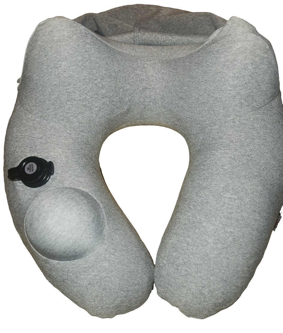 Hooded inflatable neck pillow for travel – ideal for car trips, flights, and business travel.